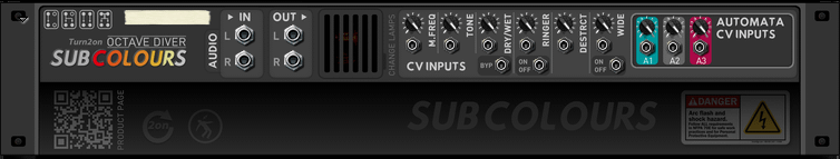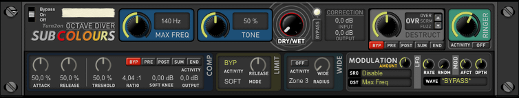 Present a sub octave generator for your signal. But its not just sub-octave genertor, not pitch-down shifter.. Like an classical divider pedal, the tone is warm, fat, and a bit synth-like, as opposed to the crisper, more acoustically accurate transpositions of modern pitch-shift pedals. This effect unit contain main function section of Octave Diver (emulate Mu-Tron™ Octave Divider pedal), control of input and output levels, Destruct section, classical ringer effect, compressor with limiter to control your signal clipping, built-in LFO and also – widening function. Its pretty good hybrid effect for various situations. Bigger aspect to run SubColours – add or generate to any sound new sub-octave with gain signal, compression, limiting and widening.