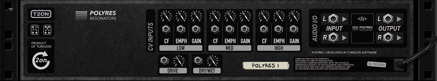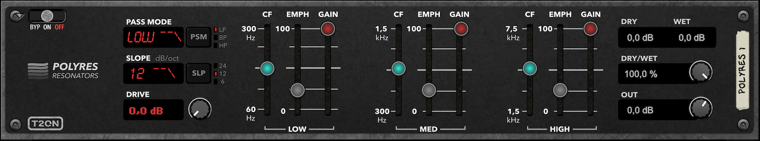 POLYRES has the same three resonant filters with Cutoff, Emphasis and Gain controls for Low, Medium and High bands. POLYRES also includes original HighPass, LowPass and BandPass modes.
